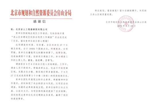 9月29日,中国中物收到北京市规划和自然资源委员会房山分局发来的感谢信,信中对其在协助开展“房山区非建设空间拆后利用工作调查”过程中表现出的专业素养和奉献精神给予充分肯定。